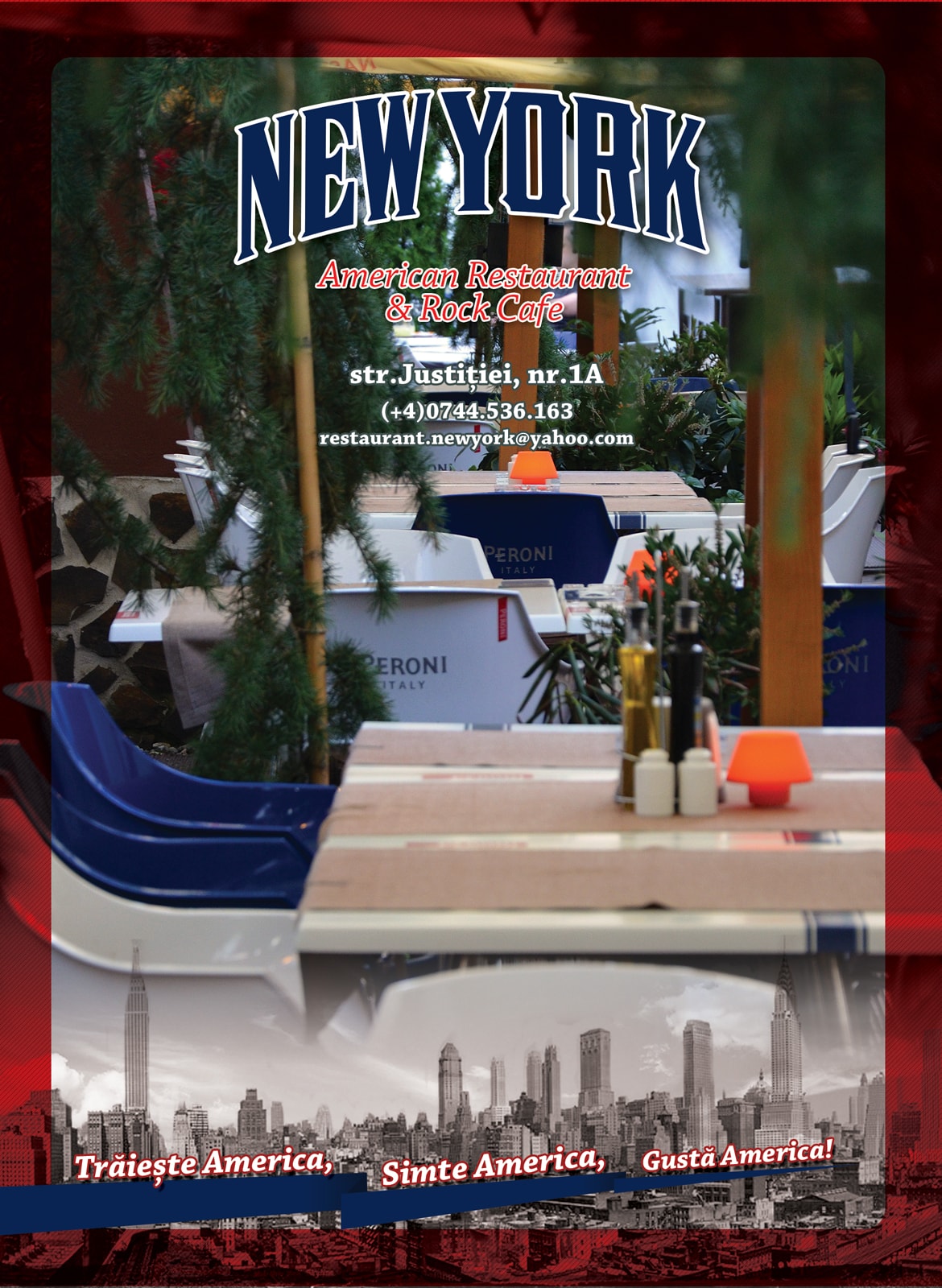Start spreading the news... there's only one joint like this in Sibiu! The name says it all - Live America, Feel America , Taste America! New York Restaurant&Rock Cafe will rock your taste buds! Escape the noise of the city's center, and come by New York Restaurant to enjoy a different kind of experience. It's welcoming, relaxing, there's hearty dishes all over the menu, and the music will make your feet dance under the table.